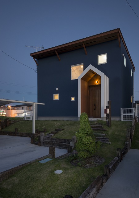 敷地の高低差による道からの視線のずれを活かした窓配置をし、周囲からの見られるストレスを解除。2階にある大きなFIX窓は空を切り取ったように絵になる風景が室内から毎日感じられ、夜になるとその透明なガラス窓からは帰宅を待ち望んでいるように優しい明かりが、外の芝を照らしてくれている。