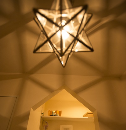 夜は2階の大きな窓からシンボリックな照明がデザインになり、外部のアプローチにさりげなく明かりが落ちる。