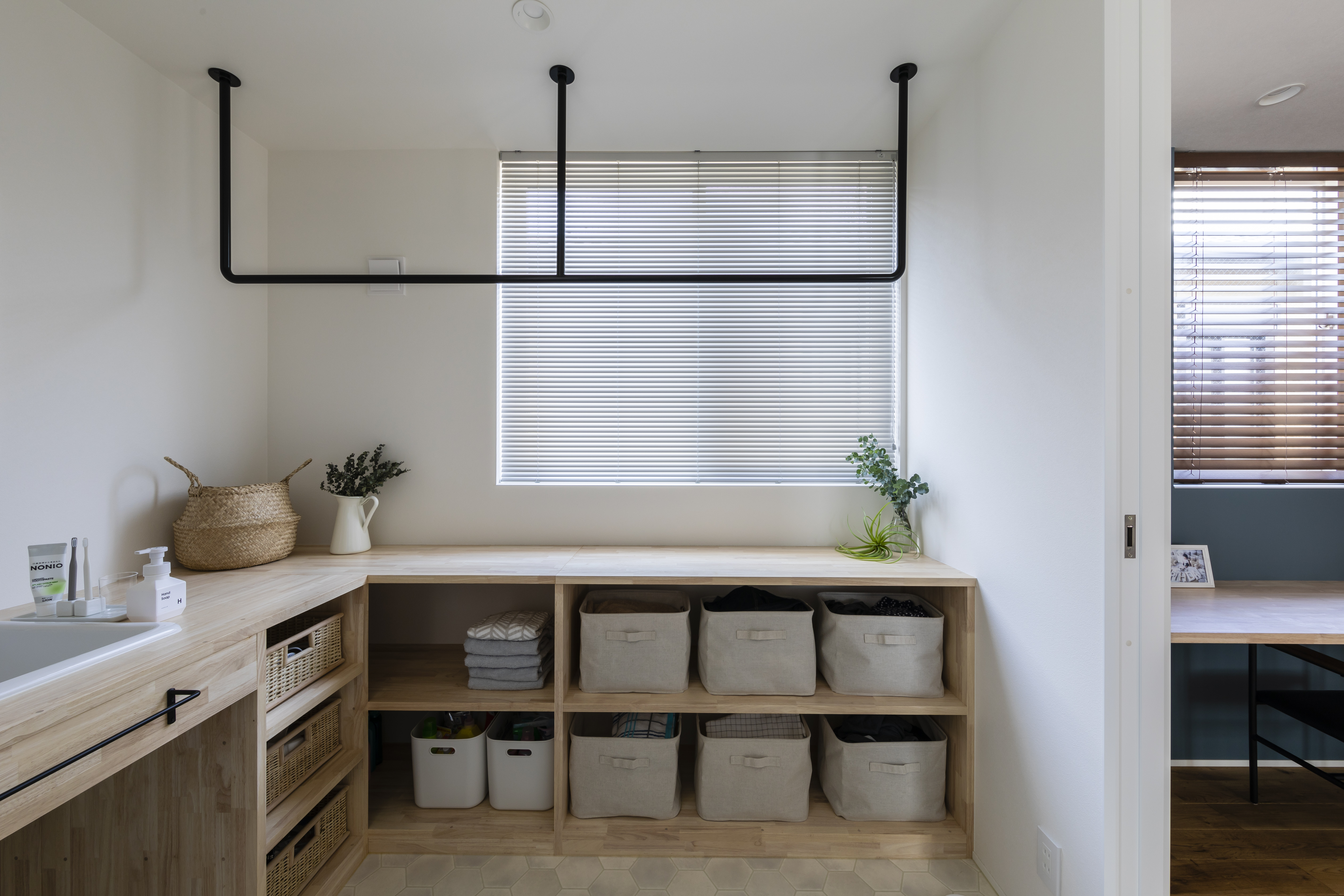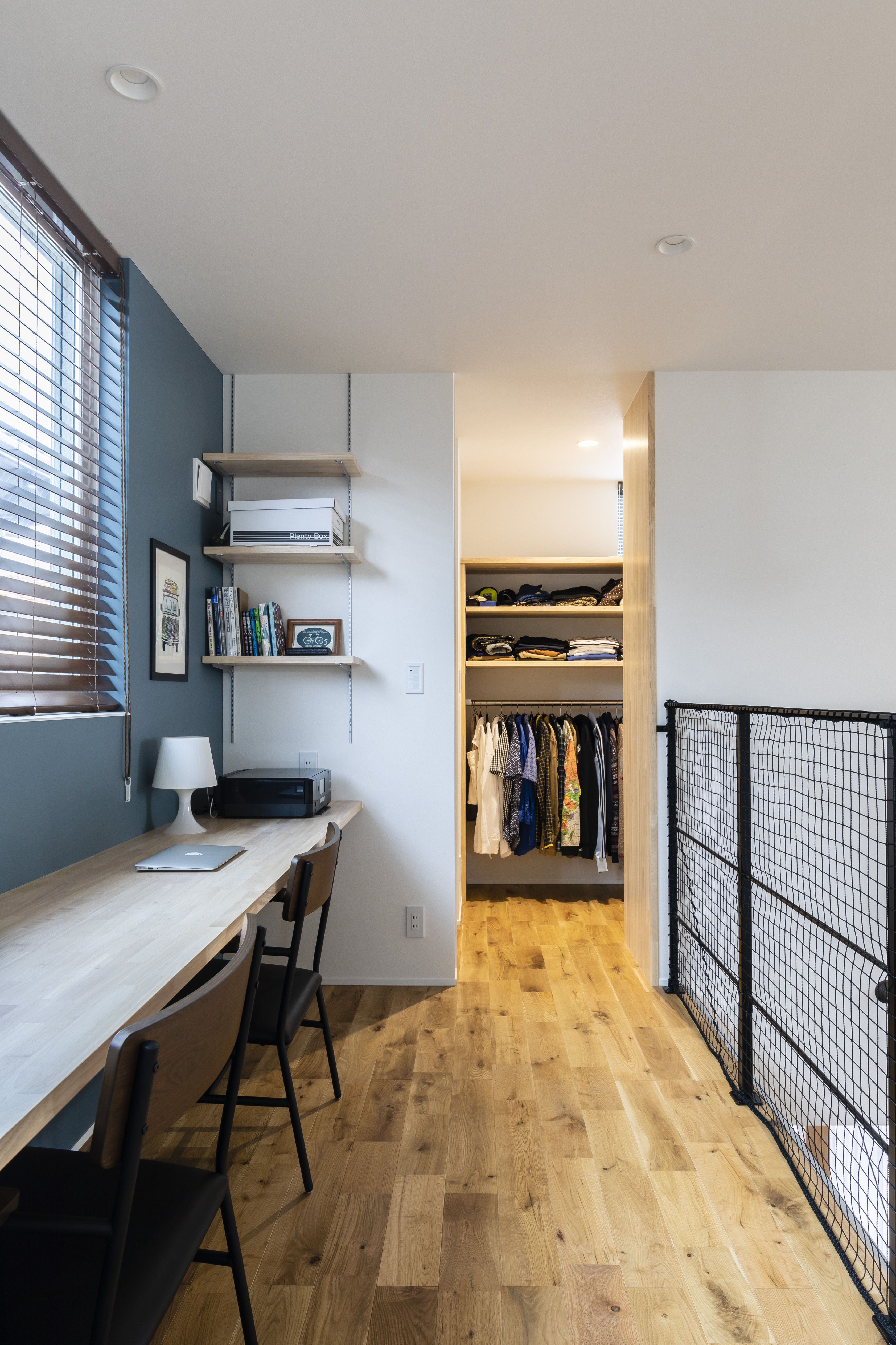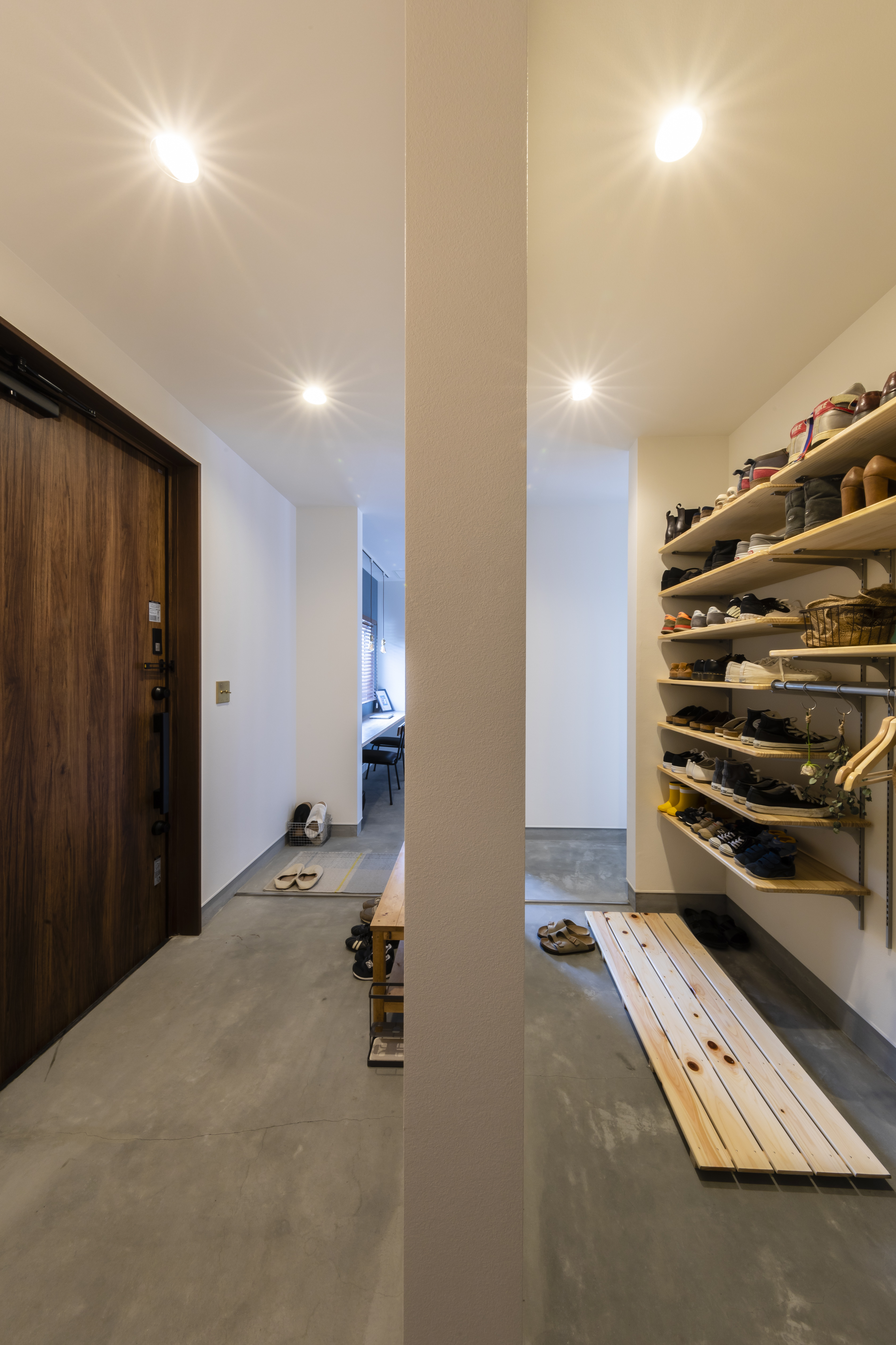 ◎広い玄関収納と、玄関から室内が丸見えにならないような工夫。土間空間はカフェのような非日常的なイメージに。