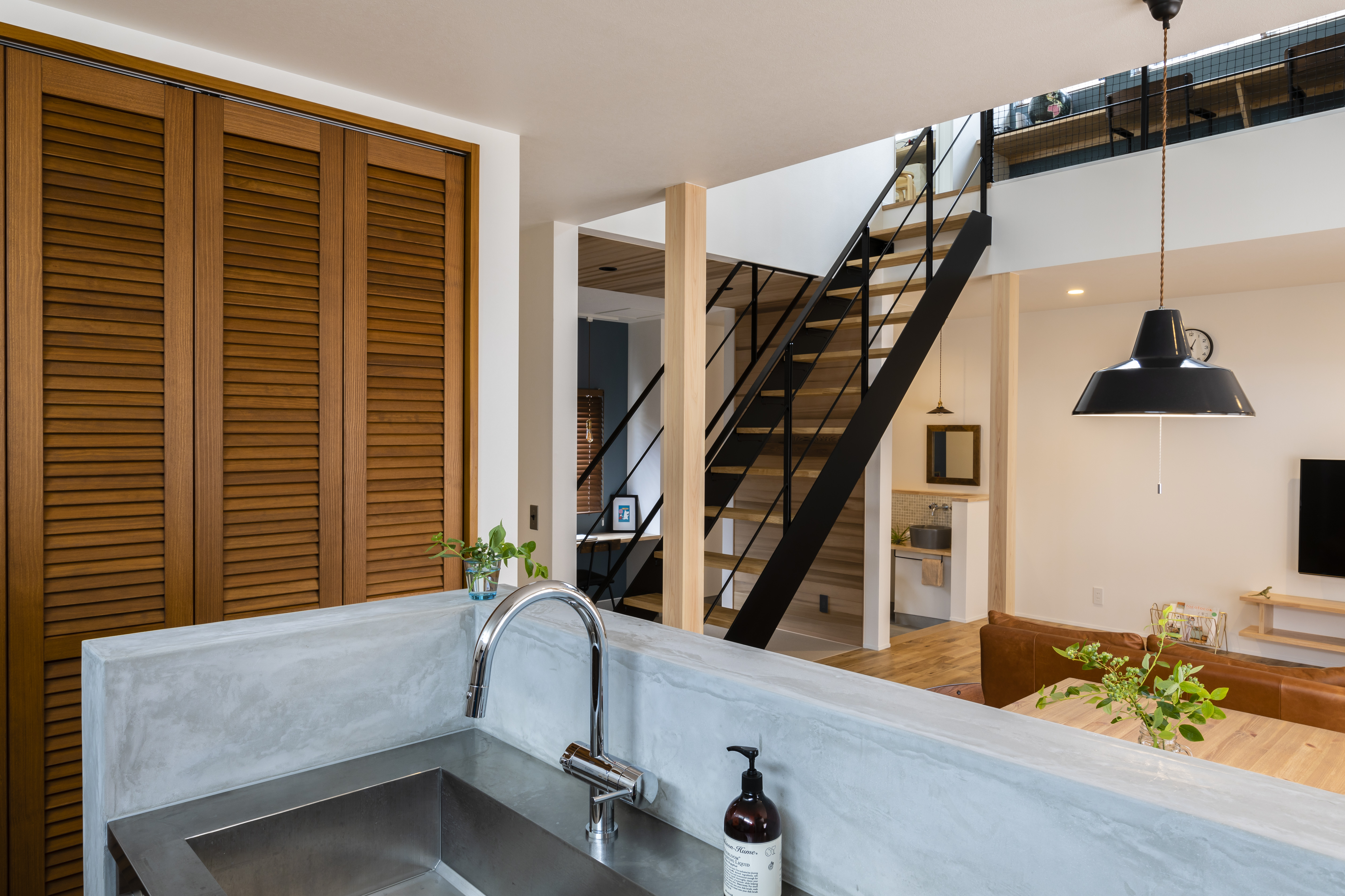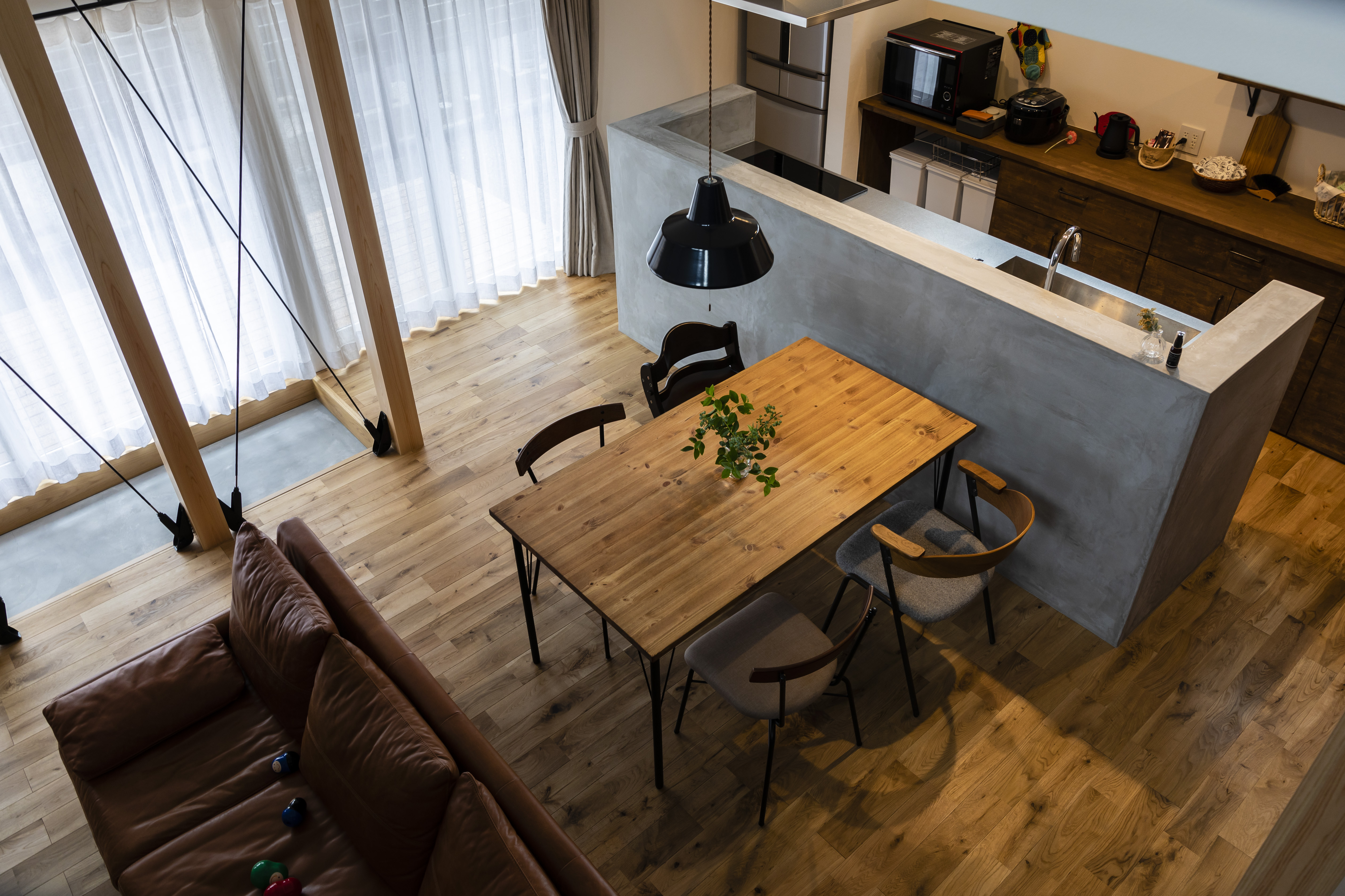 ◎こだわりのモルタルのキッチン。キッチンから1階全体が見渡せて、2階のデスクにいるご主人とも会話ができるように。
