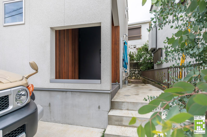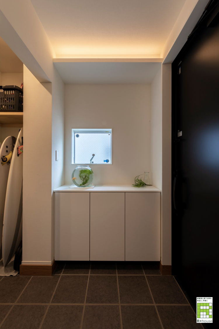 ◎サーフィンが趣味のご主人のために、玄関にサーフボードを置ける玄関クロークを設置。