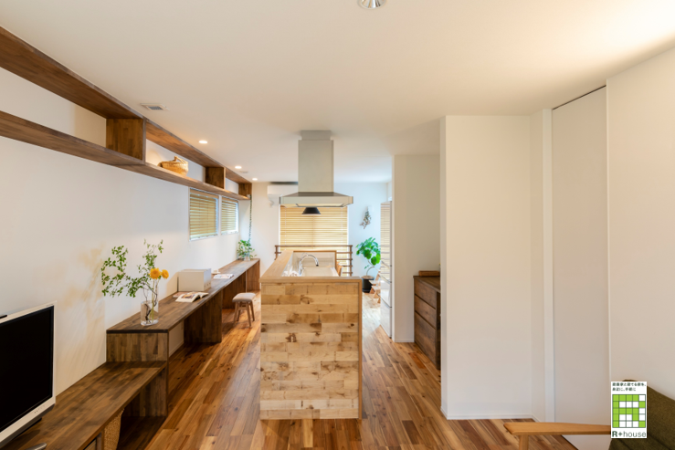 ◎「キッチンにいると孤独感がある」という奥様のお話を建築家がくみ取り、リビングダイニングの真ん中にキッチンを。