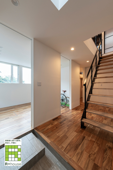 ◎自転車を置けるように奥行を深くした玄関土間。そこには趣味のアウトドア用品も整理。